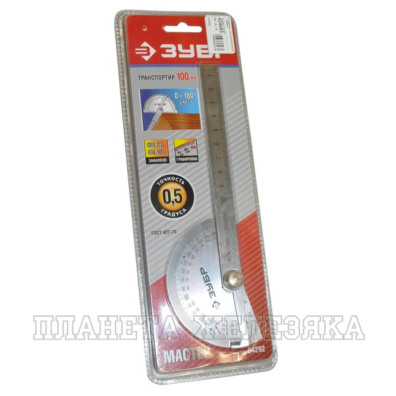Транспортир применяется для разметочных и измерительных работ. Полотно из нержавеющей стали с травленой шкалой увеличивает срок службы инструмента. Измерительное полотно изготовлено в соответствии с ГОСТ 427-75.