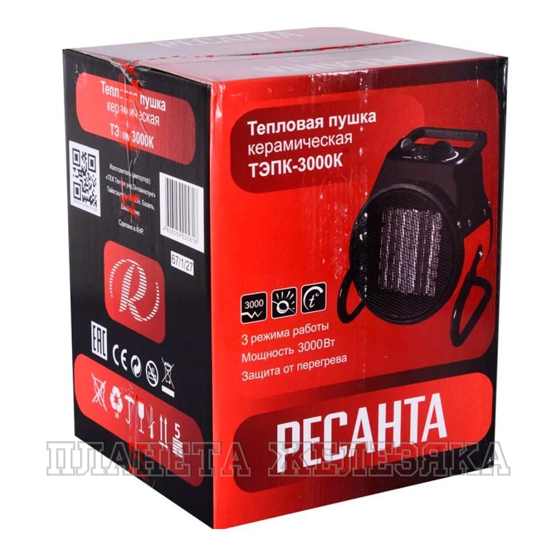 Благодаря небольшому весу и компактному размеру электрическую тепловую пушку легко перемещать и она не занимает много места. Автоматическая защита от перегрева делает эксплуатацию Ресанта ТЭПК-3000К безопасной и комфортной. Рекомендуется устанавливать оборудование на полу, исключая ковровое покрытие.