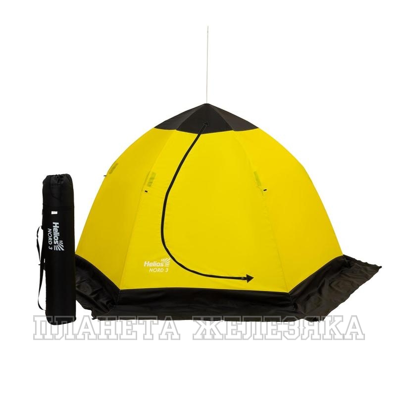 Зимняя палатка NORD-3 торговой марки Helios сделана специально для зимней рыбалки. Рассчитана на двух-трех рыболовов. Имеет быстросборный каркас зонтичного типа. Это максимально экономит время установки. Легкая каркасная конструкция позволяет передвигать палатку на новое место ловли не собирая и не разбирая палатки. Ткань тента Oxford 210D, PU 1000 мм защитит от ветра и снега. Внешняя ветрозащитная юбка сохранит тепло внутри, если её прикидать снегом. На углах юбки есть петли из строп для крепления ввертышами ко льду (ввертыши в комплект не входят).