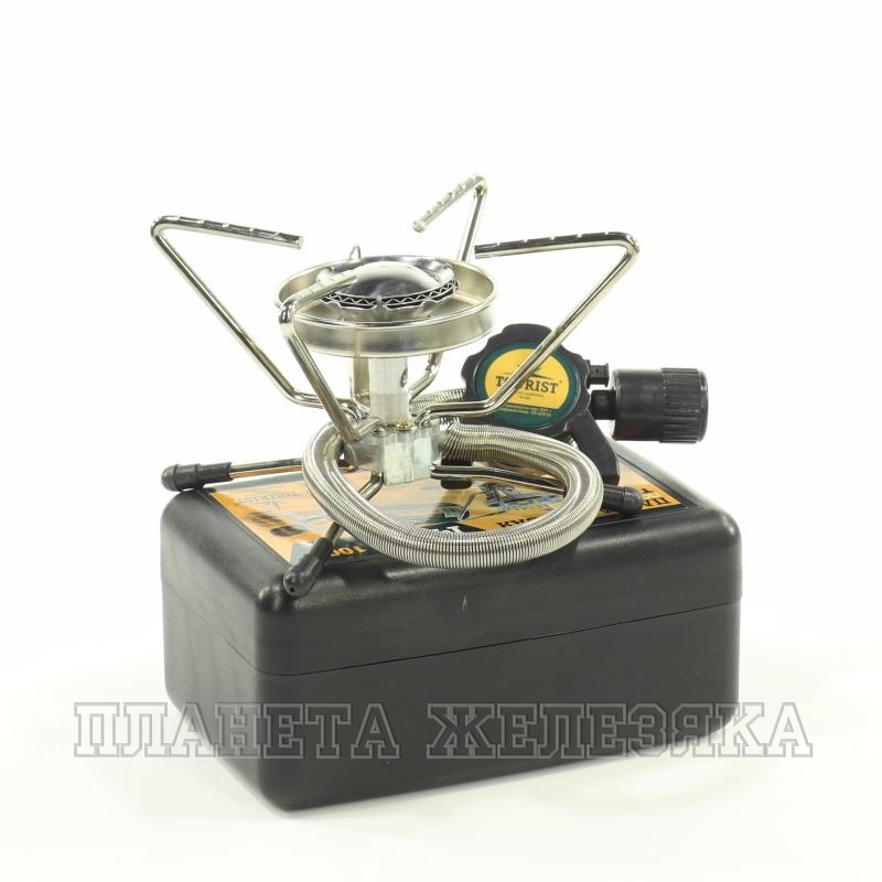Мини плита в пластиковом кейсе с пьезо элементом на выносном шланге. Использование шланга повышает безопасность, а также удобство при эксплуатации. При низких температурах есть возможность поместить баллон в более теплое место для подогрева газа (например, спальный мешок).